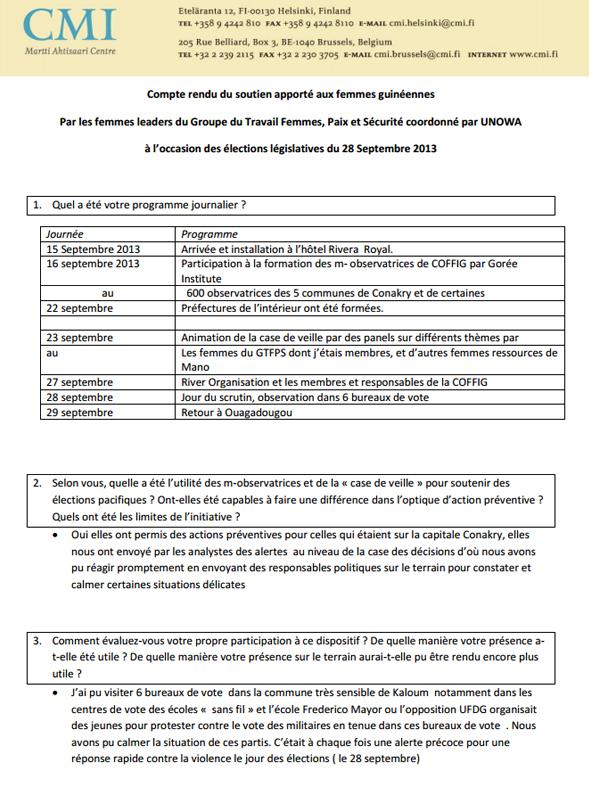 ![]() | Compte rendu du soutien apporté aux femmes guinéennes Par les femmes leaders du GTFPS Selon vous, quelle a été l’utilité des m-observatrices et de la « case de veille » pour soutenir des élections pacifiques ? Ont-elles été capables à faire une différence dans l’optique d’action préventive ? Quels ont été les limites de l’initiative? - Oui elles ont permis des actions préventives pour celles qui étaient sur la capitale Conakry, elles nous ont envoyé par les analystes des alertes au niveau de la case des décisions d’où nous avons pu réagir promptement en envoyant des responsables politiques sur le terrain pour constater et calmer certaines situations délicates |