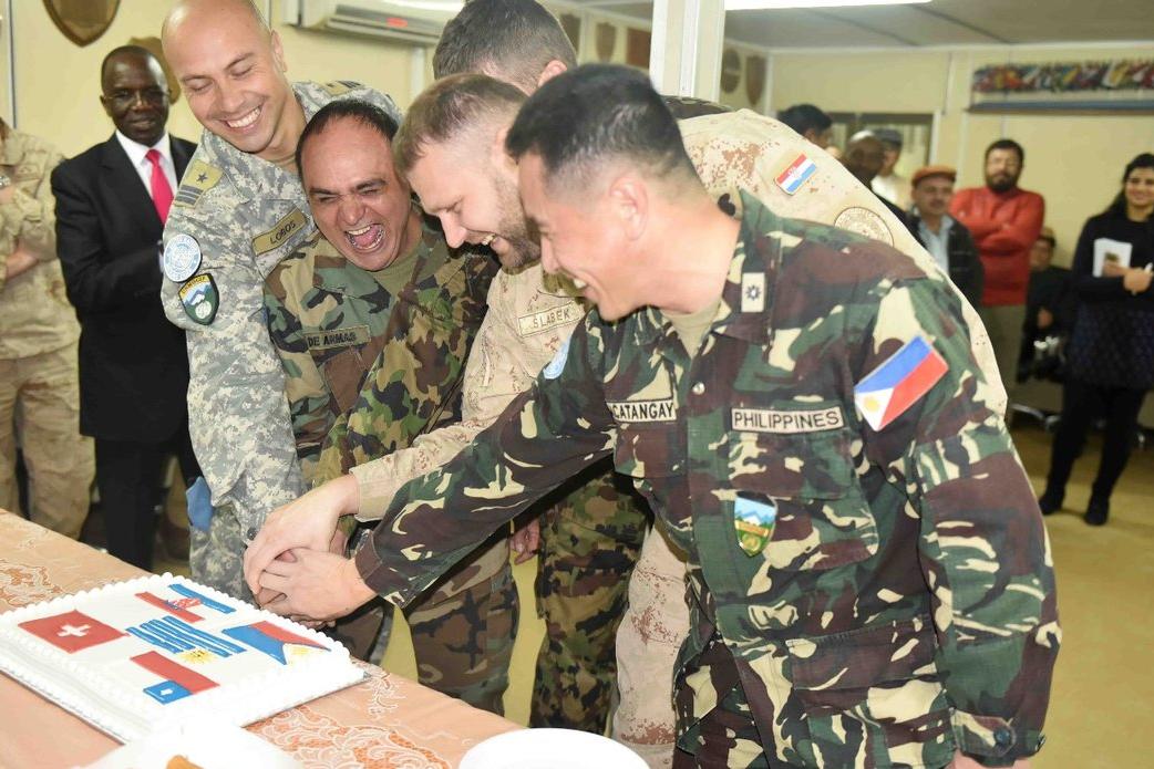 From left to right, the five outgoing UNMOs cut a cake during their farewell ceremony at UNMOGIP: Lt. Colonel Javier Cesar De Armas Serron (Uruguay), Major Henry Macatangay (Philippines), Major Victor Rodrigo Lobos (Chile)…