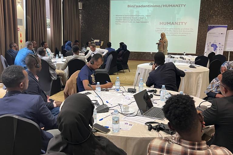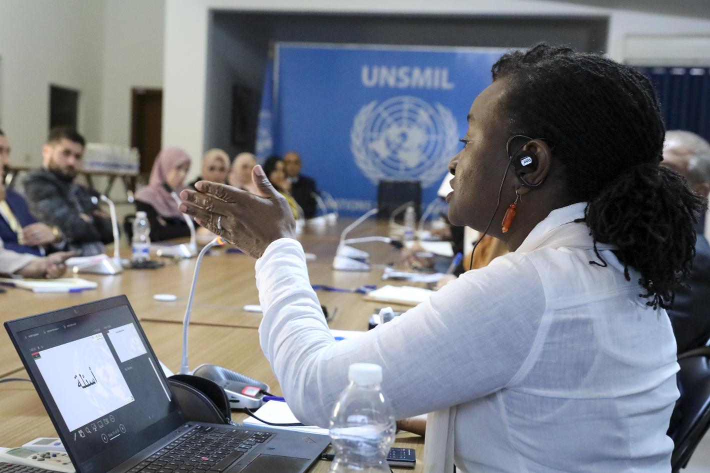 Mpako Foaleng, Chief of the UN Standing Capacity on Security Sector Reform, leads a discussion about civil society participation in security sector reform at the Tripoli offices of the United Nations Support Mission in Libya in February 2023.