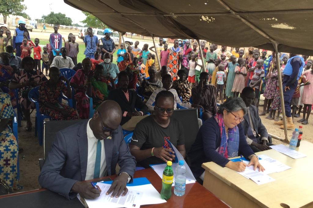 Finalizing the paperwork for the handing over of a radio station renovated by UNMISS to the Unity State government. Photos: Luk Riek Nyak/UNMISS